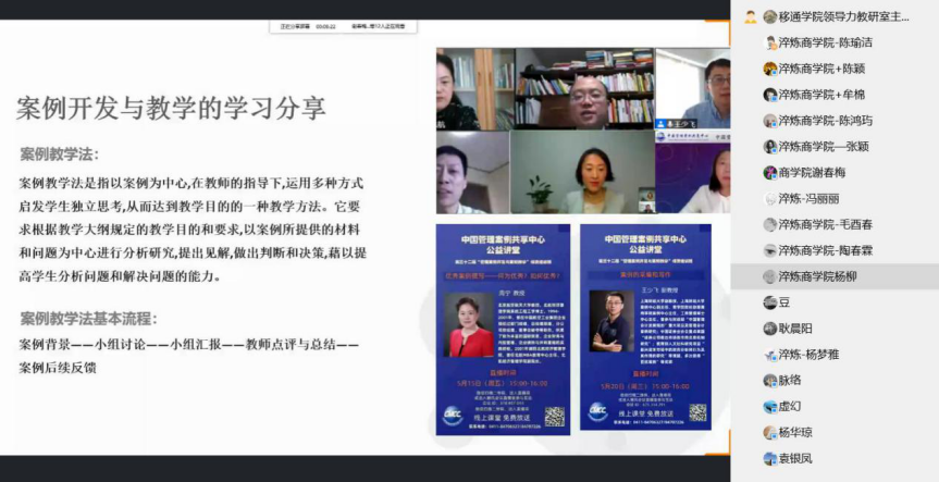 为进一步提升全校新商科教师团队案例开发的兴趣与能力,提高教师广泛参与案例教学的积极性和水平,5月12日晚6点,淬炼.国际商学院领导力课程教研室老师们共同线上学习了大连理工大学副教授黄海昕老师的案例行动学习观摩课,该课程是首次国内线上互动式教学的新模式。老师们也在线上学习之后就如何将商科案例更好地融入新商科课程教学之中,如何更好地进行互动教学、探索新商科教育改革方式展开了激烈的讨论。