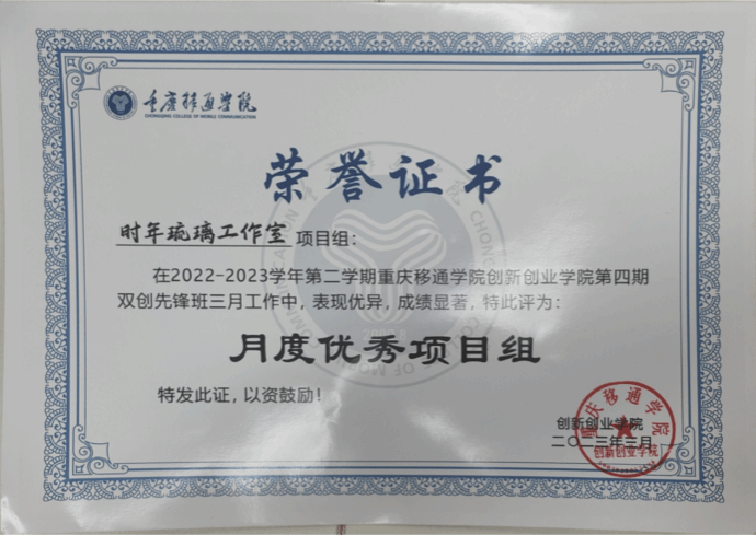 时年琉璃工作室成立于2023年2月,是一家围绕合川高校衍生周边产品的工作室,团队成员为第四期双创先锋班成员。团队秉持专业打造学校独特IP输出校园文化,为学校师生提供精美的文创产品。项目包含设计毕业季纪念品、高校馈赠伴手礼、以校园为基础的创意文创产品。