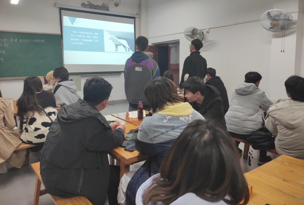 苏老师让同学自己来做小主持人,组织大家分享自己临时创作的小诗,让这个环节完全属于学生。其中几位同学向大家分享了自己的小创作,袁连昊同学站起来朗读了他的诗歌:“看赤色的蚕将悼念,捎向天堂/ 纸张的尸体之下 夸父残缺的双腿/ 那是,我的童年”肖林博同学这样写:“花朵上的嗡嗡声 你听 那是虫子在悲鸣/ 栖息在花蜜中的梦境 不愿为混沌草原发声 当清澈的甘露燃尽 听风亦不是雨/ 凤鸣呵 从此便是光景”这两位同学显然都有自己的理解,关于诗歌与自我。或许语句还稍显稚嫩,但已然踏出了表达的第一步。杨云翔同学即兴写下的几行诗句是这样的:“深夜的街灯、穿梭的车辆,你的声音和思念消失在街角/ 没有人走过、指尖敲击的桌面与甜美的夜晚,我转身走向人群,直到消融。”诗歌工坊的助教聂欢同学也大方的站起来分享了他的小创作“喜欢花的春天 便将自己埋在春的土里/ 花蕊上会有我的花粉 穿过溪流/ 当大海将我包围 我与你同住在一间云里 谈论起 冬天雪下的落叶”每位同学的作品里都有用到对自己来说有意义的意象表达,在同学们分享过后苏老师提到诗歌有个人风格是很重要的一点,许多同学的小创作都有些个人风格在里面,这是一件好事,只有拥有了属于自己的独特风格,才更容易脱颖而出,寻找到更好的感悟方式。