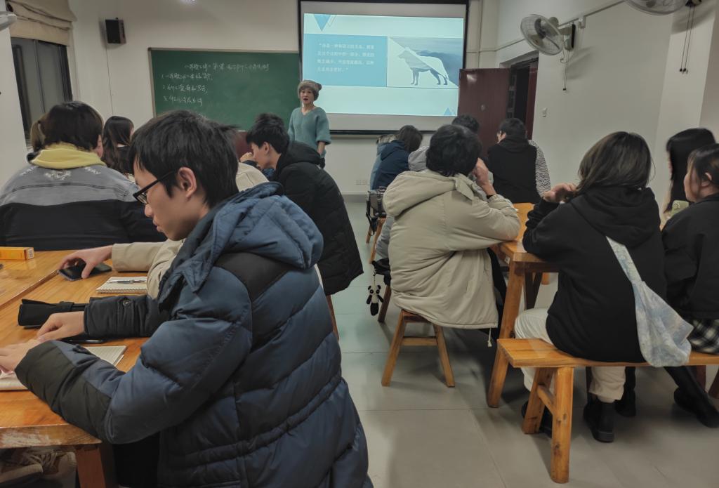 在这场小小的讨论过后,苏老师告诉我们诗歌的原料是浓缩、分行分节、乐感与意象,是这些让诗成为诗。在诗歌创作中浓缩是非常重要也很显然的一点,字数少所以自然要在有限的字句里将重点表达清晰,将情感融入其中,这里苏老师列举了一首她的作品《濮阳街头》:“没有人问我从哪里来/ 我从我的身后走来/ 握着糖葫芦和异地的光线/ 在濮阳的街头 做一个陌生女人/ 过着干净的余生”。苏老师让大家去体会和感受这首诗所带给读者的感受与想法。每个同学都有不同的理解,有人认为这首诗是落寞的,一个在陌生街头的女人,有着丰富的过往,从身后走来却握着糖葫芦,保持着单纯和美好。有人认为这首诗是洒脱的,作者不在意这个陌生街头的人,就像陌生人也不在意这样一个女人一样,对未来有向往有规划的去度过干净的余生。每个人的解释是不同的,感受也不同。这就是一首好的诗歌,可以用精炼的文字表达出丰富含义的艺术。没有一个正确的解释,因为每个读者看后都有自行想象和感悟的空间。这也是苏老师想告诉大家的,一首好的诗歌读了以后不会让所有读者都只感受到一个意思,而是多元的,多重的感情流露。