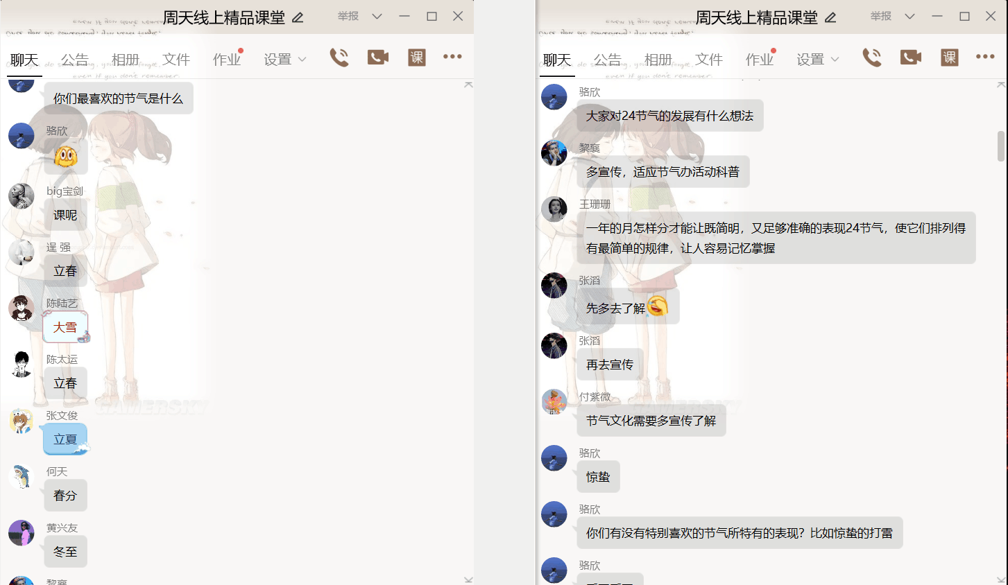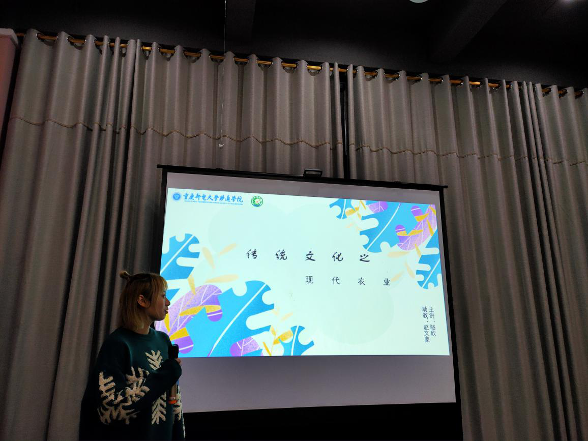 来自农耕协会种养技术部的骆欣同学从二十四节气的内容、古今背景、对应的农事向大家进行阐述,从而展开课堂,并对每一个节气做了详细的介绍从而延伸到传统文化的传承。两千多年来,二十四节气以历法、谚语、歌谣等形式广为流传,在传统农业生产和人们的日常生活中有着广泛应用,深刻影响了中国人的思维方式和行为准则,是一年中农民从事农耕的重要时间依据。从古至今,中国人一直顺应节气时令,形成了独特的风俗民情。岁时节俗,非遗文化,无不饱含着浓厚的民族文化气息。在课堂即将结束时,主讲人提出了一个值得深思的问题。“大家对24节气的发展有什么想法?”随即大家展开了激烈的讨论,各抒己见。