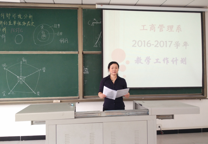 孙玺主任还对2016-2017学年我系的教学工作计划进行了宣讲和部署,明确了本学年的工作目标和工作重点。她指出,我们要以培养经管类应用型人才为目标,探索有特色的应用型人才培养模式;加强核心专业和特色专业的建设,结合人才需求现状与趋势,探索合理的专业结构和专业发展;加强重点课程和特色课程的建设,重点进行综合实训教学改革;运用互联网技术和新型信息技术丰富教学手段,革新教学方法,不断提升教学质量;深入推进校企合作与产教融合,强化教师的实践技能,提高双师素质,打造我系优质教学团队。最后,通过热烈的讨论,老师们对孙主任提出的工作目标达成了共识,表示对今后的工作重点更加明确,也有信心齐心协力完成目标,并进一步提升我系的核心竞争力,共筑工商管理系美好的明天!