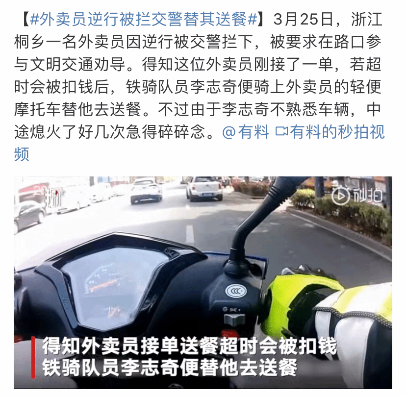 梅若书院的宋雨琦同学分享到:“经常点外卖的同学们都知道,把外卖准时送达是考量外卖员服务最重要的标准,一个投诉就可能让外卖小哥几天都白干。电动车无牌、无证需要暂扣,但考虑到外卖小哥这一单外卖还没有送出,执勤民警决定驾驶警车帮他送餐并且还不忘提醒买家给五星好评,这一暖心的举动,我看到了课本中无法学到的知识——法治中的人情味。”