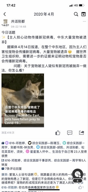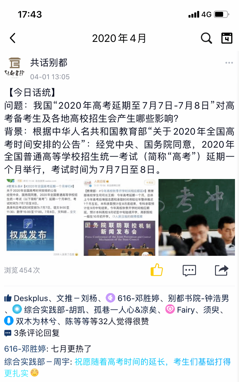 信息是我们感知世界的触角,优质的信息在刺激着哦们的神经末梢。身处碎片信息的海洋中,我们偶尔需要静心,认真读完一篇有力量的文章,也需要深入思考这个世界发生的一切。或许是关于一个平凡人物内心世界的特写,或许是展示事件真相的报道,又或许是直击人心的影像故事。为培养学生的逻辑分析能力,养成理性思考的习惯,别都书院结合书院领导力实施路劲,设计打造今日话“统”系列话题讨论活动,通过线上自媒体平台、线下宣传阵地每周推出时下热点、焦点话题,引导学生积极讨论、思考,4月,别都书院结合疫情期间系列社会热点,共计推出3项话题,872名学生积极参与讨论,发表了自己的意见。
