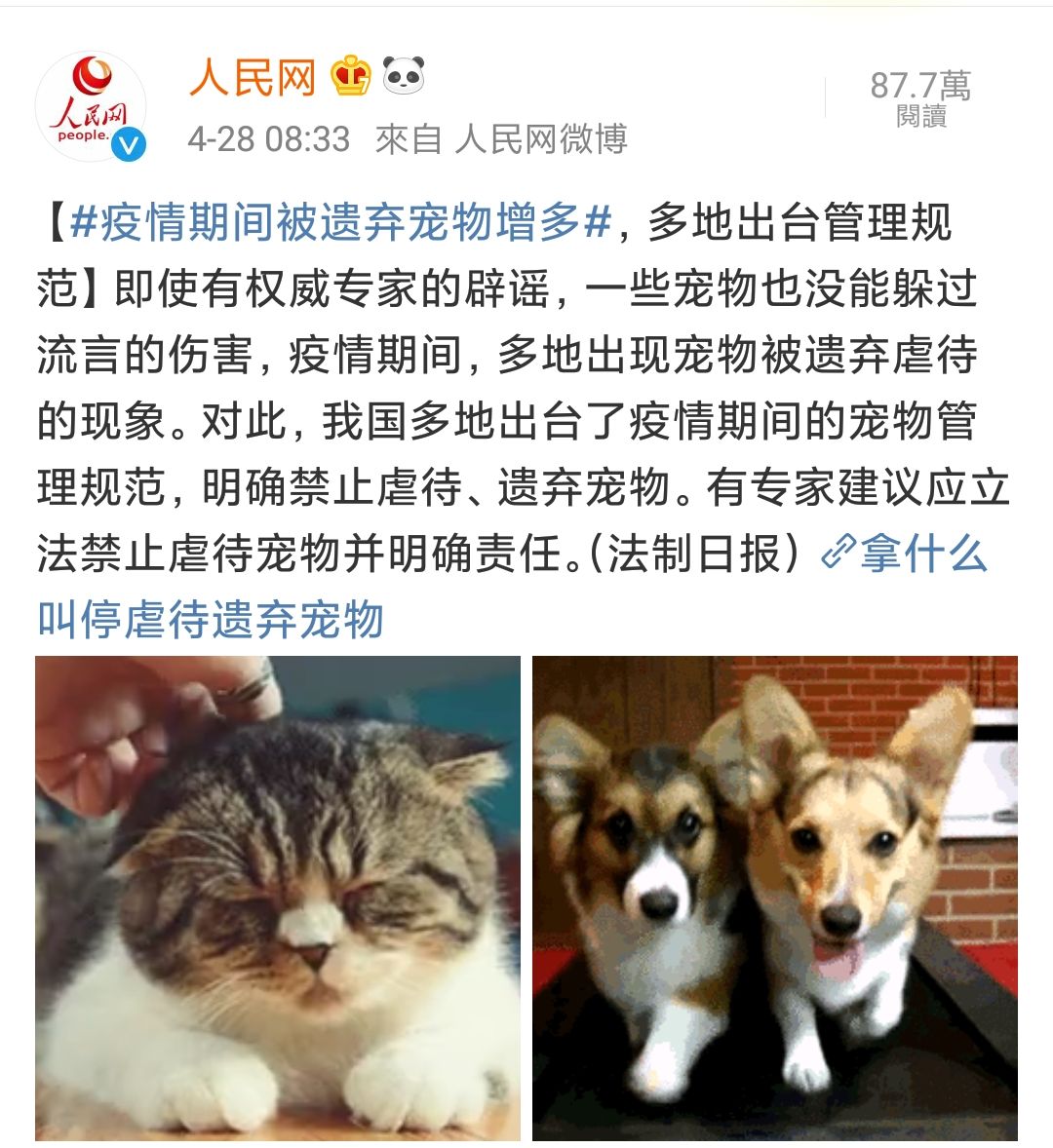 “宠物会染上新冠病毒、宠物会传播新冠病毒等类似说法在网上迅速蔓延”这一说法在网上铺天盖地的传播起来,但好在很快就被咋们国家的权威组织和专家纠正,这样的情况也得到了有效制止。