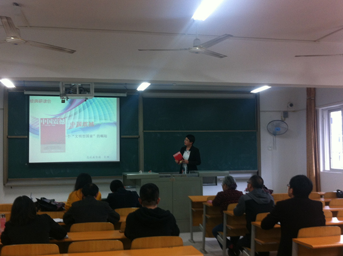 本次活动延续第一期的议程。首先,宋姗老师与大家分享了张维为教授的《中国震撼—— 一个文明型国家的崛起》一书。宋老师首先从整体上介绍了这本书的内容概况,然后重点对“中国模式的八大特点”和“中国发展的八大理念”做了介绍,此书作者凭借走访一百多个国家和地区、研究海外的工作阅历,从客观、中立的立场研究了中国的发展模式。整本书数据详实,案例新颖且提出了很多新颖的观点。宋老师指出向大家推荐这本书的目的是让思政课教师更好地了解中国的发展状况,有效解决思政课教学中遇到的一些难题,书中很多事例可用于思政教学做案例,对学生有很强的吸引力。宋老师的交流课件做得图文并茂,演讲也深入浅出,大家就交流的内容各抒己见,刘宗粤教授指出宋珊老师的分享很符合青年人口味,内容也非常适合思政课教学,提出的观点非常好,整个交流气氛十分热烈。