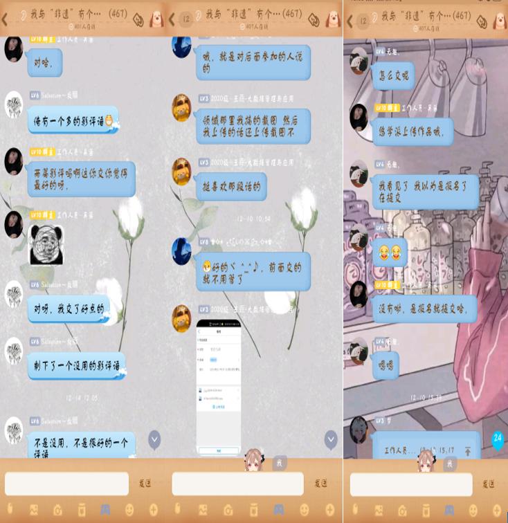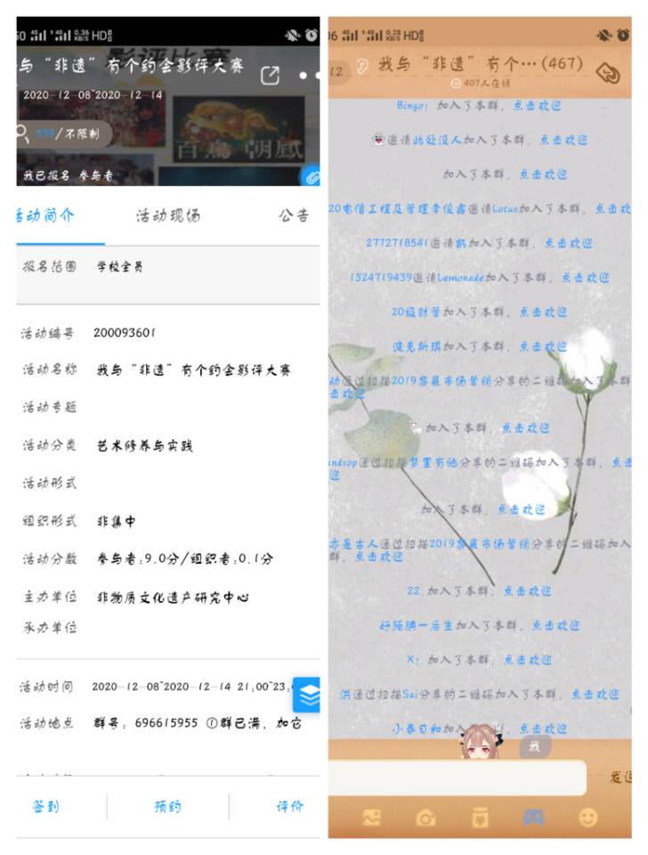 “我与非遗有个约会”影评比赛活动采取线上提交影评的方式,对“非遗月度观影”活动所观看的《霸王别姬》、《百鸟朝凤》、《闪光少女》、《饮食男女》等电影进行深度评价,写出对电影深刻的理解或新颖独到的见解,影评类型分别为短评与长评。当活动发布后,同学们积极加入活动群,了解影评具体细节,陆续地提交影评。由于本次活动同学们较高的参与性,所以某些同学在参加活动后,还将本次非遗活动加以宣传及推荐给身边的人。由于参赛人数过多,我们为因群人数限制,而不能加入活动群的同学们创建活动分群,以便于同学们可以更好的参加本次比赛。此外,因为同学们的积极参加,本次活动也创校非遗活动参与人数新高。