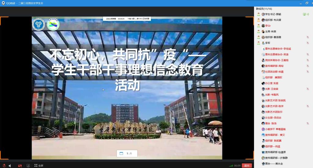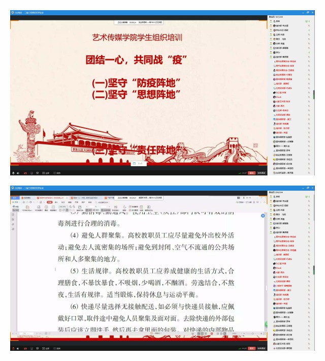 面对新冠肺炎疫情的全球性挑战,为了提升艺术传媒学院青年学子的使命感与爱国热情,做好学生骨干队伍担使命促成长的能力提升,2020年3月18日16时,艺术传媒学院团总支组织开展了完满教育学生骨干理想信念教育线上培训活动。本次活动由艺术传媒学院副院长李克伟以及团总支书记李军两位老师做专题培训,学院学生组织全体成员参与。