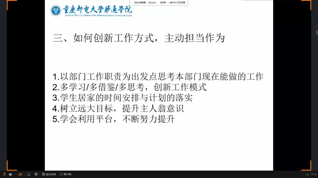 随后李军老师以“创新工作方式,勇于担当作为”为主题进行了培训交流。他从工作方式转变、各部门工作现状总结反思以及如何提高干部干事主观能动性进行了培训。李军老师对各部门的近期工作做了总结,并提出了针对性建议。他指出,不论是干部还是干事,都应主动思考部门内各项工作如何开展得更好、更有凝聚力等问题。事无大小,必谨之,必慎之,必知之。在疫情的特殊时期,即使是在家里,部门工作和组织建设同样不能落下。反思自身、考虑集体,这是责任,也是初心。现阶段有新困难、新挑战,但同样也有新机遇机会,新作为。