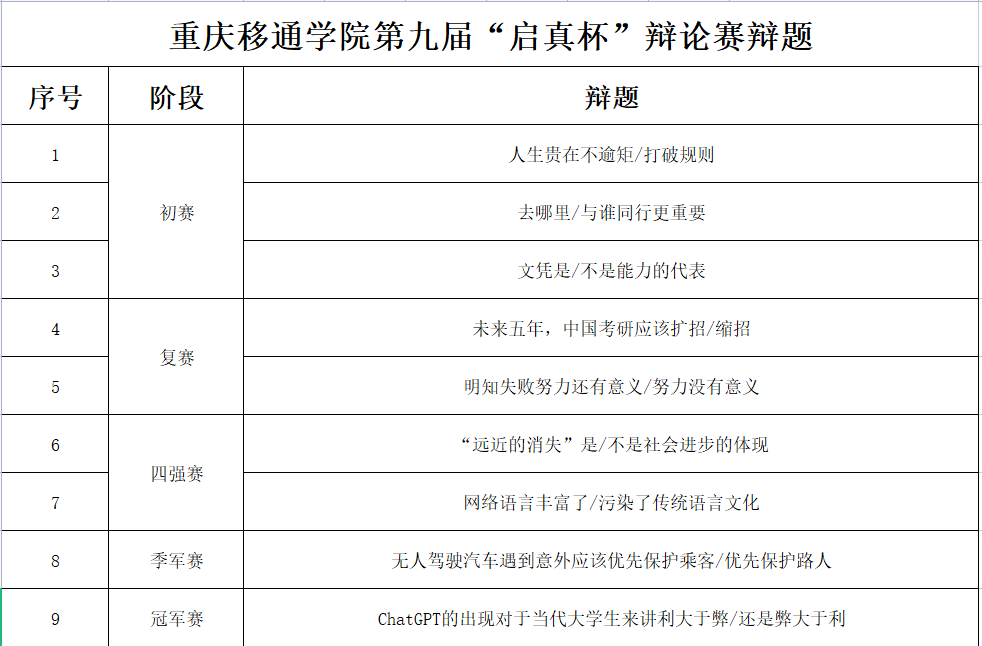 真理是越辩越明的,作为当代青年大学生的移通学子在辩论赛场上从不畏惧表达自己的观点。本次“启真杯”辩论赛辩题选择新颖有趣、紧贴同学们的校园生活、聚焦社会热点问题、探讨人生价值取向。初赛探讨价值取向、社会能力;复赛紧抓教育热点、人生意义;半决赛研究社会语言、社会现象;季军赛以无人驾驶汽车遇到意外优先保护人的设置,从“乘客”和“路人”两个角度展开激烈讨论;冠军赛深度剖析2023的科技热点——“ChatGPT的出现”在当代大学生中引发的问题。每一道辩题都发人深省、每一场论辩都传递着移通能量、每一场比赛的探讨对于帮助同学们洞察时事、了解民生、思考社会都具有十分重要的意义。