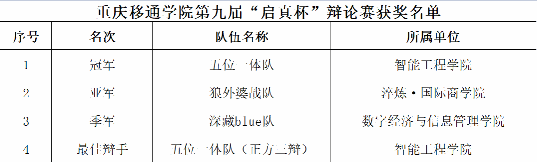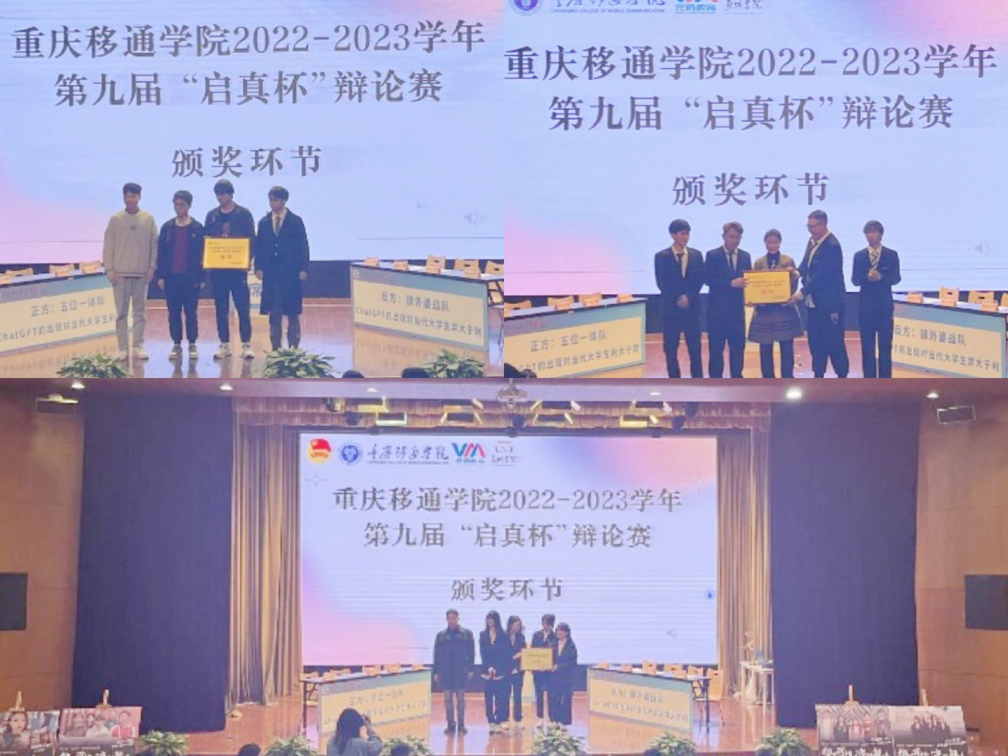最终,来自数字经济与信息管理学院的“深藏blue”队获得季军,淬炼·国际商学院“狼外婆战”队获得亚军,智能工程学院“五位一体”队获得了重庆移通学院第九届“启真杯”辩论赛的冠军,同时正方三辩方获得了本次比赛的最佳辩手。