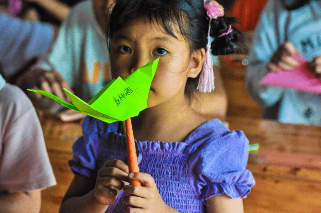你的梦想是什么?小朋友将梦想写在彩色纸上,“我的梦想是当一名画家”“我的梦想是一名医生,治病救人”他们用彩笔勾勒梦想的蓝图。志愿者们教小朋友折千纸鹤,并在纸鹤上署名,贴在心愿墙上。小朋友清澈明亮的眼睛里满是期待与坚定,他们平凡闪耀,每一个孩子都有无限可能,希望志愿者可以浇灌他们梦想的种子,让爱在戴花村生根发芽。