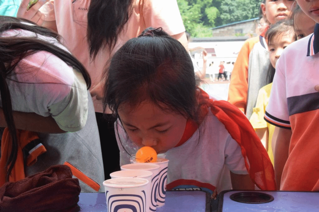 (乒乓过河,小朋友在志愿者对引导下完成游戏)