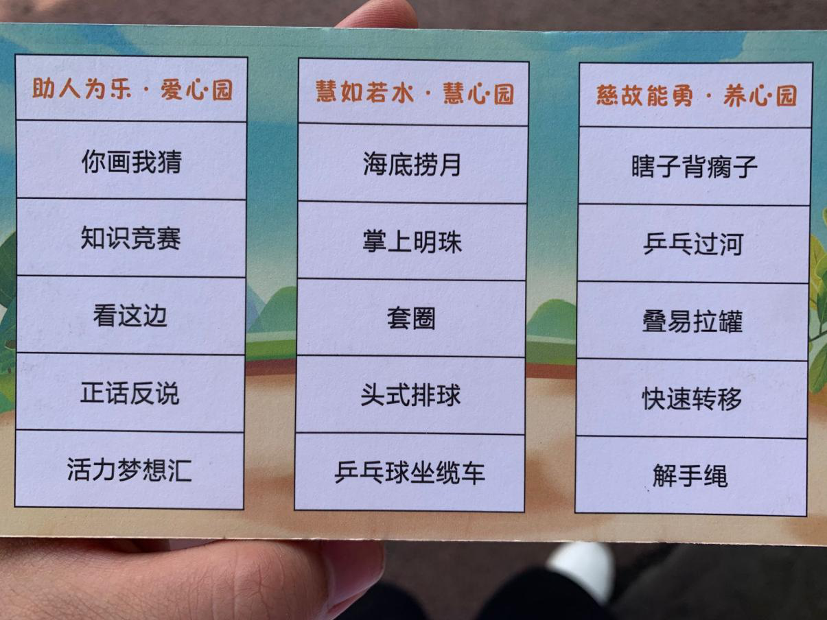 此次六一乐园活动是学校课堂教学的延伸性活动,主要以寓教于乐的游戏形式展开,使学生们在游戏闯关时找到自己的亮点。游园会包括了助人为乐·爱心园;慧如若水·慧心园;慈故能勇·善心园三大部分,每个板块有4-5个小游戏,累计一定数量的印章,便可得到精美小奖品。