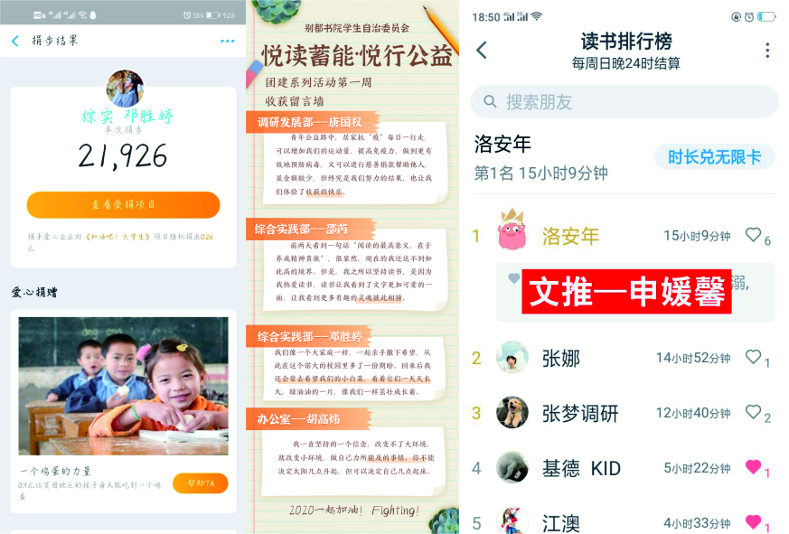 全体同学们踊跃加入到每日一阅读和每日居家一行走的活动中,截止目前,第一周“读书特攻队——每日一阅读”活动全员总计阅读时长达339.483小时,以王者荣耀平均20分钟为一局进行换算,成员们以感受阅读的时光代替了1018.45场国内顶峰销量的手机游戏对决;“青年公益路——每日居家一行走”,全员总计居家行走步数达到106万3339步,以平均步幅50厘米为参考依据,将全体成员累计步数进行换算,得出全体成员一共围绕操场一共行走了1329.17圈!