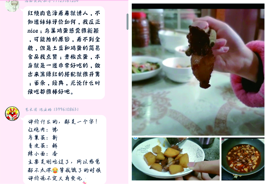 北山书院冯元老师、各部门学生干部代表,于厨房共同烹饪爱的味道。香软可口的土豆红烧肉、香脆美味的鸟巢鸡蛋、如雪花般盛开的青椒皮蛋、麻辣鲜香的干锅鸭掌、东北特色菜肴“地三鲜”等美食,纷纷通过直播呈现,于线上大众投票的方式进行角逐。师生互动的形式丰富多样,营造了浓浓的家文化氛围,实现了隔离不隔离爱,切实拉近了师生之间的距离。
