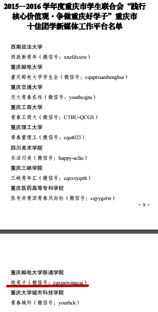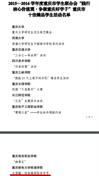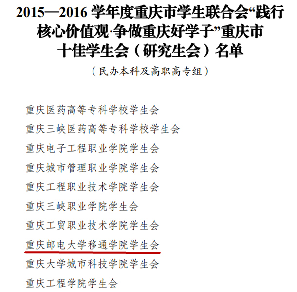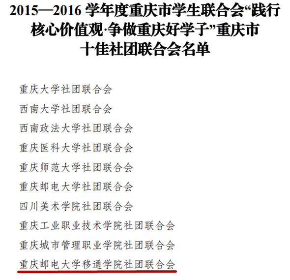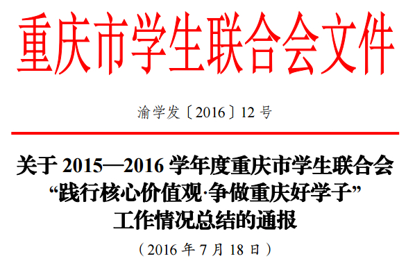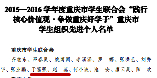 为表彰先进、树立典范、激励各级学生组织更好地开展工作,市学联于日前开展2015—2016学年度“践行核心价值观·争做重庆好学子”工作报告活动等评选工作,我校在此次评选活动中荣获重庆市十佳学生会(研究会)、重庆市十佳社团联合会、重庆市十佳精品学生活动、重庆市十佳团学新媒体工作平台四项大奖及三名重庆市学生组织先进个人的荣誉。