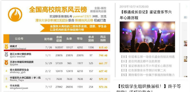 它是我校新闻宣传资讯的一把好手,更是我校关注量最大、影响力最广的新媒体公众平台。我校“晓英才”微信公众平台本着为学生分享校园资讯,传递完满教育理念和动态的宗旨,不仅为广大移通学子提供便利的校园动态查询窗口,更是一个传递思想、自由交流的平台。成立至今逐步完善自身功能:成绩查询、官方电台、院系小站、校园最新动态、校园介绍……这些信息都可以在“晓英才”上轻松的查询。推送至今“晓英才”单日稿件阅读总量创10万次新高;关注人数达40017人,稿件留言共计3197条,多份稿件受到凤凰博报、大学生新闻网、重庆市学联“学载青春梦”等多家媒体平台转载,并连续九期获得重庆高校团学微信风云榜团委运营公众号前十强佳绩。