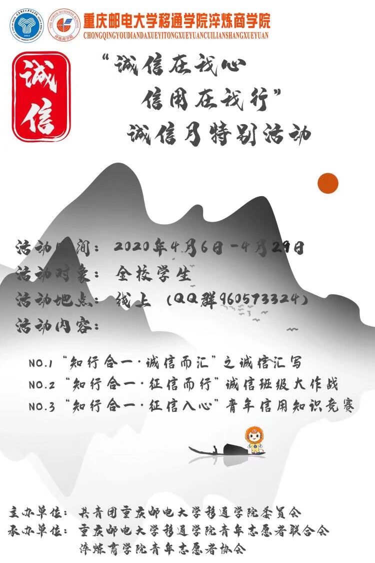 随着互联网的发展,以个人信用体系为基础的信用经济,正在中国蓬勃发展。近年来中国社会信用体系建设发展迅速,激励守信和惩戒失信的制度不断完善,信用记录在我们的生活初步建成,所以打造优良的信用对我们来说尤为关键。小诚大立,以德为本,为使每一位移通学子都能够注重道德诚信的培养,在生活中用诚信的行为洗涤自身浮躁的情绪,淬炼商学院青年志愿者协会于2020年4月6日至29日开展了以“诚信在我心·信用在我行”为主题的诚信月系列活动。