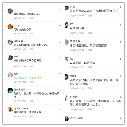 诚信汇写拉开了此次活动的序幕。参与者们以在淬炼商学院青年志愿者协会官方QQ留言或是评论的方式,分享自己创写的诚信标语或是自己身边的诚信故事。通过“云分享”,一传十,十传百,同学们再次将诚信纳入自己的“待办录”:今天,你诚信了吗?