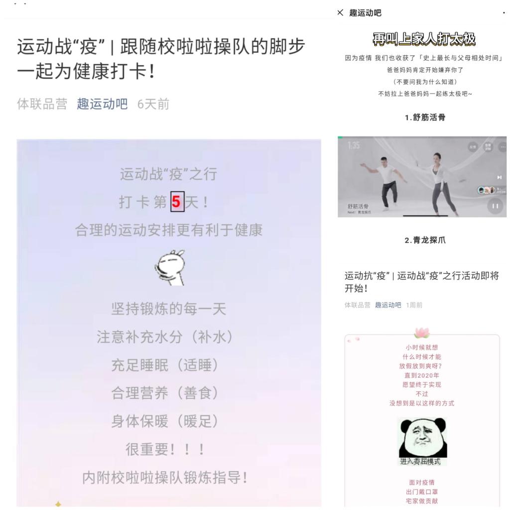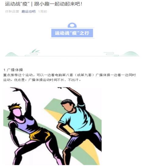 运动战“疫”·行,居家锻炼不停歇。此次活动主要以培养运动习惯,促进身体健康为目的,通过公众号,如“趣运动吧”、“Twinkle啦啦操排舞队”等,推送居家锻炼动图和运动锻炼视频资讯,不断为同学们提供居家锻炼指导,实现“隔离不隔爱”保证身体健康。