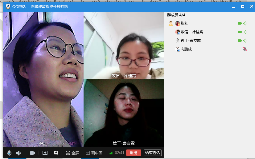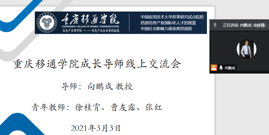 时间飞逝而过,将近一个半小时的线上交流会还意犹未尽。最后,向教授称赞我校青年教师名师指导计划非常具有前瞻性和创新性,通过成长导师计划也看到移通学院信息产业商学院战略发展的步伐稳健有力,希望三位青年教师好好珍惜学校对青年教师成长、成才的关怀,能在教学、科研上不断成长、不断突破,为移通学院“四位一体双院制”的特色办学贡献自己的创造力和青春活力。