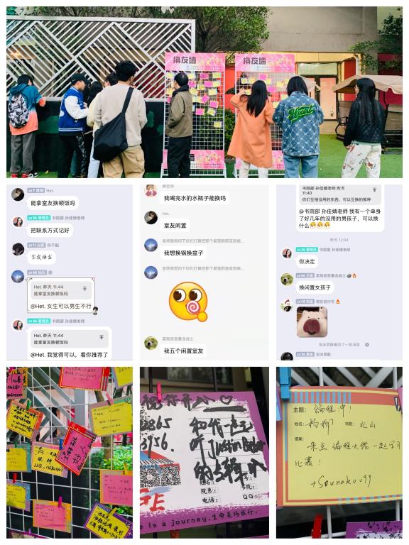 书院QQ群里,孙老师一句“大家有没有闲置物品想交换的?”“能拿室友换顿饭吗?”、“我想换锅换盆子”、“室友闲置”、“换个过了四级的”……千奇百怪的留言纷纷涌现,形成室友推荐、夸赞室友的一片热闹场面。立足大家的需求,我们立刻行动,小广场上“换友墙”得到大家热烈欢迎。一张卡片,留下你的联系方式,发表你的推荐理由,说出你的互换想法,我们一起在“换友墙”下交个朋友。春日正当时,让樱花与浪漫相遇,让我们的故事在爱莲开始。