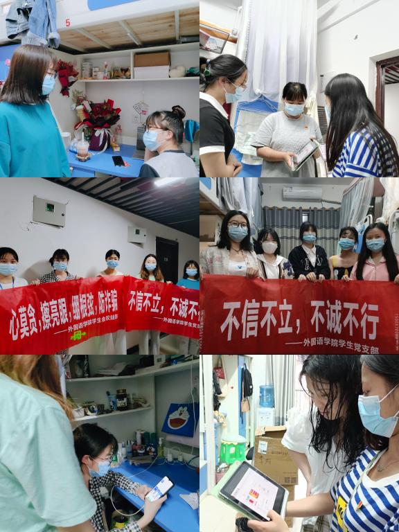 为创新党员活动方式,充分发挥学院学生党员的模范作用,同时配合学院做好诚信宣传工作。5月11日、18日,外国语学院党员诚信互助小组一组以及二组的成员们积极践行了作为一名党员同志,需要全心全意为人民服务,坚持从群众中来到群众中去的群众路线的工作方法,来到了天渠、松格等书院宿舍,为大家普及诚信宣传,以及防诈反诈知识。希望同学们多加强防范心理,提高警惕,构起一道防骗墙,不给骗子可乘之机。