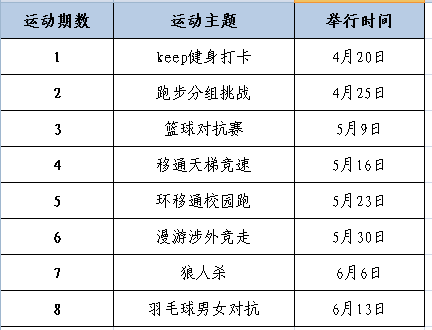 两个月共八期,每周三的晚上,廊桥师生不见不散,每期的运动主题又各不相同: