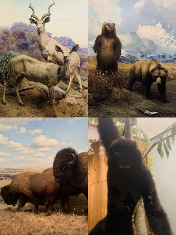 来到纽约自然历史博物馆门前的大雕像,我们都不约而同的,想到某一部熟悉的美国电影《博物馆奇妙夜》,这部影片中有勇猛的古战士、狰狞的史前生物、消失的族裔,都在万籁俱寂的夜晚鲜活起来的奇妙场景,这些在美国自然历史博物馆都能够找到,电影中出现的恐龙化石,以及大象等,都完全采纳于真实的场景,这让我们仿佛置身于影片当中。博物馆分四层,展馆正门有座一身戎马的西奥多·罗斯福的塑像。第一层有北美森林、生态百态展览厅、哥茨曼地球展览厅、纽约州环境、海洋生物、北美哺乳类动物、哺乳类动物、西北海岸印第安人馆、人类生态学与进化、若斯陨石纪念厅、摩根宝石纪念展览厅、古根亨利矿物展览厅等。其中每一部分的构思和布置均雄奇壮观,如进门大厅中央即陈列巨型八头大小象标本,四周为狮虎鹿豹等兽类标本。在二楼,有亚洲哺乳类动物、罗斯福厅、惠特尼海鸟纪念展览厅、斯托特亚洲人种展览厅、阿克莉非洲哺乳动物展览厅、非洲人种展览厅、世界鸟类展览厅、墨西哥和中美洲展览厅、南美人种展览厅等。在三楼,有爬行类动物和两栖类动物馆、阿克莉非洲哺乳动物类动物展览厅、纽约市鸟类、纽约州哺乳类动物、灵长类馆、查普曼北美鸟类展览、东部林地及北美印第安人展览馆、米德太平洋人种展览厅等。在四楼,有华莱士哺乳类动物及其灭绝同类展览、原始哺乳类动物、鸟类恐龙厅,这里巨大的恐龙骨架顶天立地。还有密尔斯坦高级哺乳类动物展览厅、蜥蜴类恐龙厅、脊椎动物起源厅等。