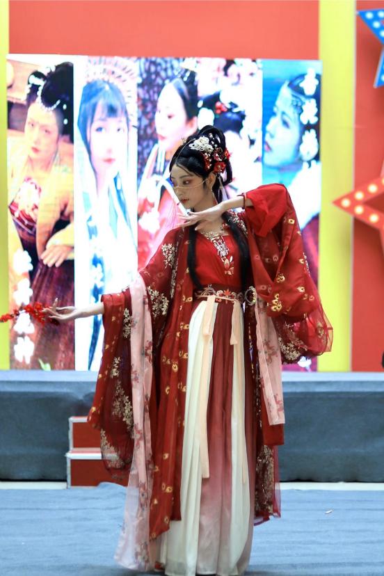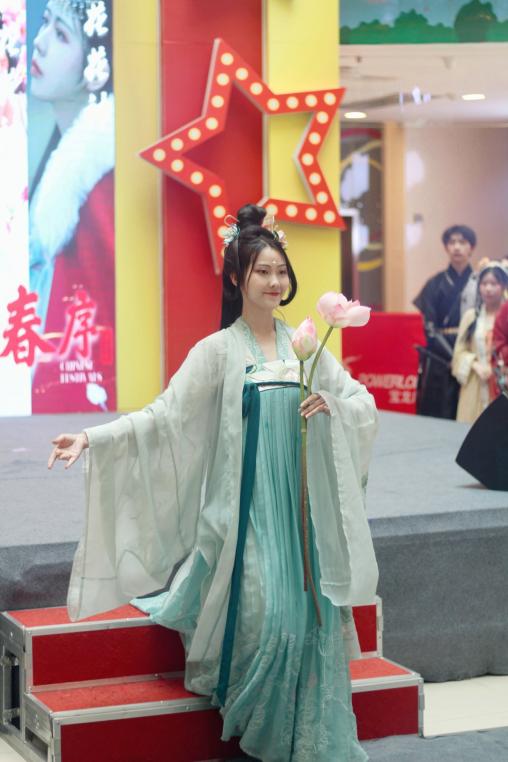 下午一点,合川区市民陆续前来,对此次活动充满期待。“百花生日是良辰,未到花朝一半春,万紫干红披锦绣,尚劳点缀贺花神。欢迎大家来到百花春序汉风活动现场……”随着主持人的介绍开场,磅礴大气的音乐缓缓响起,舞台的另一头,盛妆的古典美人们已经排列整齐准备环绕广场的巡游。罗衣何飘飘,轻裾随风还。巡游人员或是身着唐、宋、明各种形制的汉服,或是手捧鲜花扮成十二“花神”,自信地向市民朋友们展示汉服之美。行至宝龙广场大门,六位汉服小姐姐为大家带来舞蹈表演,快闪舞蹈来去匆匆,让人感叹意犹未尽。