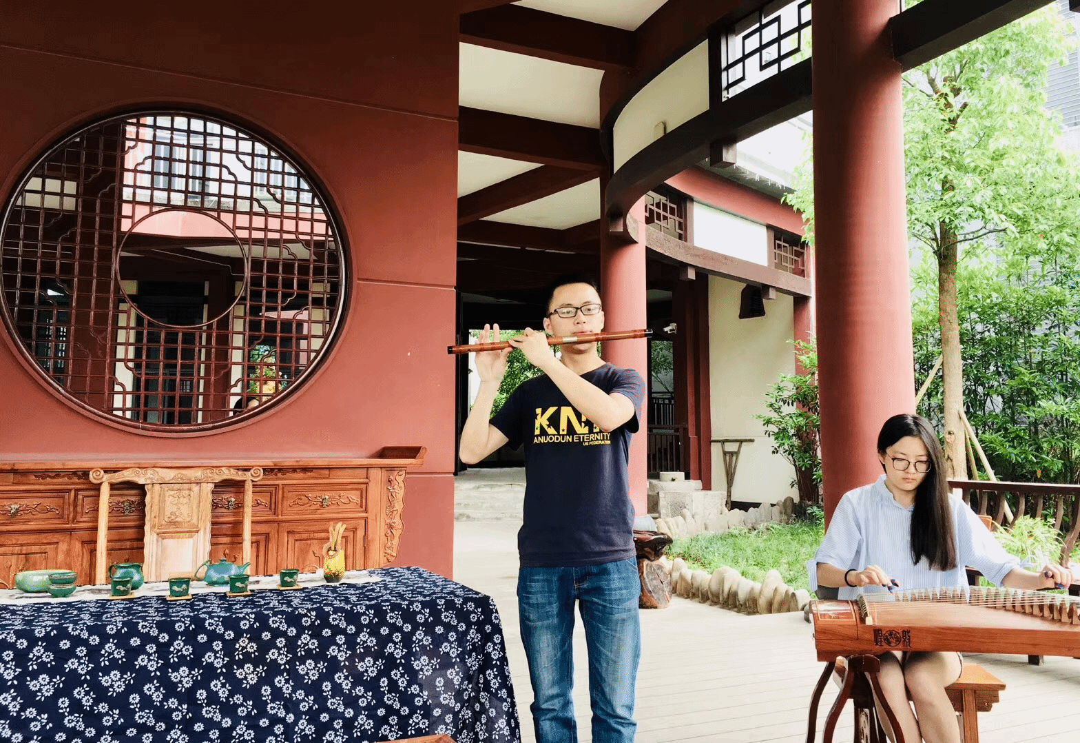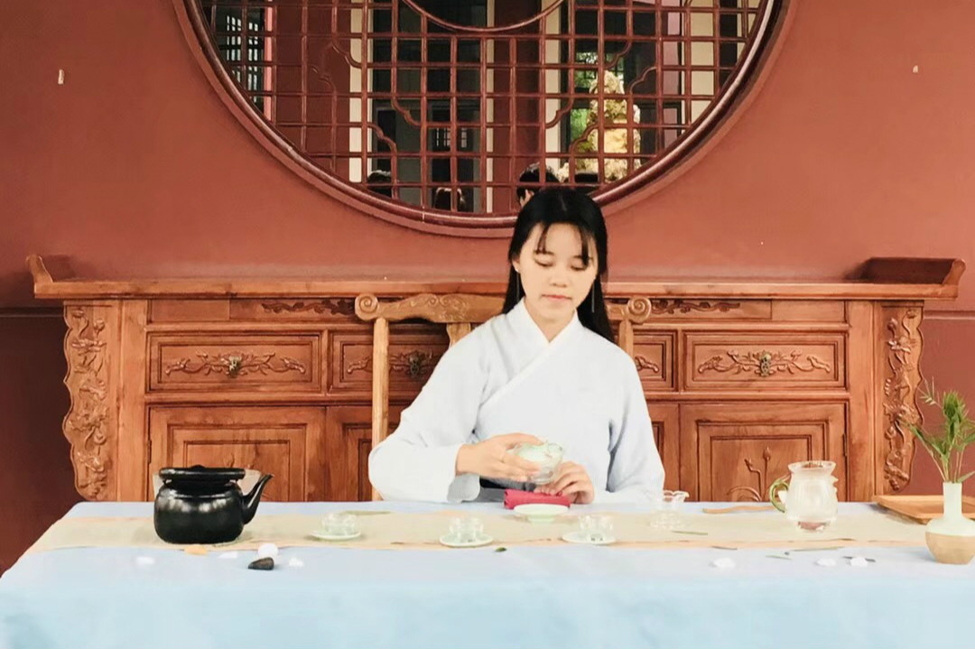本次比赛形式分为单人组和双人组竞赛,内容涉及礼仪、服装、茶艺表演及茶席设计等多个方面。跟随着敦煌古筝社和笛萧协会社长合作的古乐器表演《大鱼海棠》的音乐声,上半场的比赛拉开了序幕。