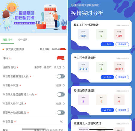 当前疫情仍在蔓延期,防控正处于关键期。疫情发生后,我校高度重视。如何随时全面了解师生的状况?如何制定学校开学开课防疫决策?学校为贯彻落实重庆市发布的重大突发公共卫生事件一级响应的相关要求,有效地预防和控制新型冠状病毒感染的肺炎疫情,在第一时间掌握并了解全校学生的疫情防控相关情况,提高信息报送效率和精准度。学校充分利用信息技术手段,自主开发了“信息填报”、“疫情打卡”、“打卡统计”功能,为疫情防控提供了移通解决方案,进一步提升我校疫情防控信息收集能力,知己知彼,共战此“疫”。