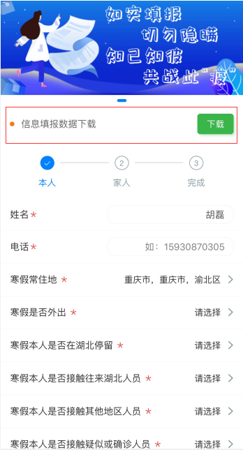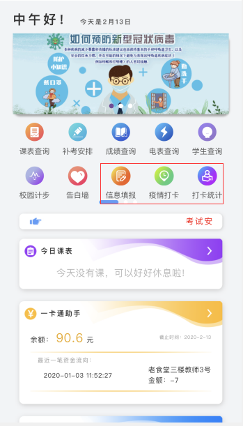 1.“信息填报”功能,根据学校需求对信息进行统一收集,“疫情打卡”要求全校学生每日填报,若学生相关信息发生变化需再次填写,有特殊情况不能填报的学生,请及时电话告知辅导员。(注:请同学们务必如实填报,不得瞒报和虚报。)辅导员和部门负责人可通过“打卡统计”功能进入及时查看师生打卡情况,有效掌握所带学生及所在部门老师防控情况,同时还能提醒未打卡师生及时填报。