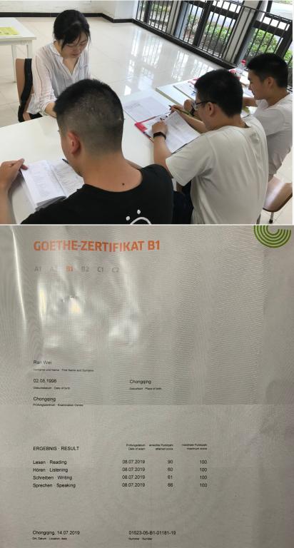 在院领导的指导下,德语教研室实施了一系列以欧标考试为导向的教学措施:让所有德语教师熟悉歌德学院欧标德语考试并在课堂上使用《歌德证书备考指南》;进行了第一次完全模拟欧标考试的期中测试,让所有学生切实感受欧标德语考试笔试和口试的氛围,并对自身的德语水平有真实的认识。为了攻克欧标考试中的口语测试这一重难点,在课堂上以及课后为学生开展口语考试适应性训练,给予学生专业的口语辅导;将周末补习班完全转化为针对欧标德语A1、A2考试的提高班,为所有学生提供进一步熟悉考试流程以及内容的机会。经过一个学期的细心耕耘,德语教研室以欧标德语考试为导向的教学工作初显成效:2017级三名学生参加川外歌德语言中心2019年7月德语B1等级考试并通过。