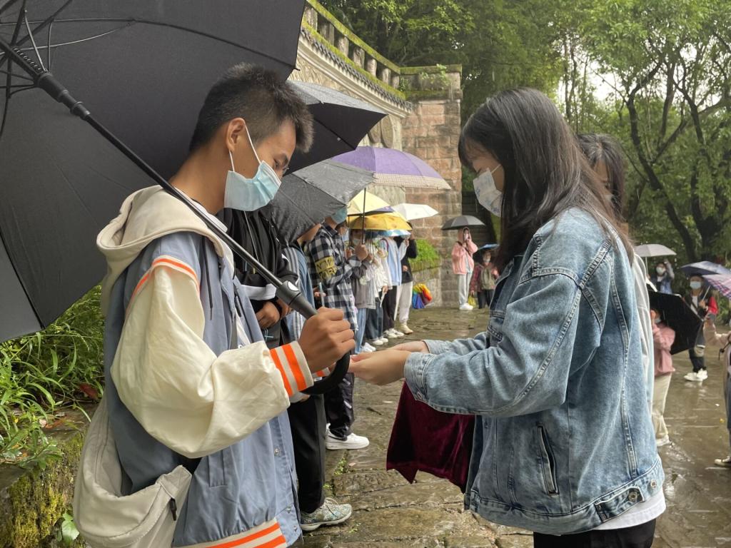 远足是廊桥传承了四年的项目,而同样传承下来的还有一些奇怪的东西——“如期而至”的大雨,只要是廊桥的户外活动就一定会下雨,操场上的每位干部向大家分发着雨衣。