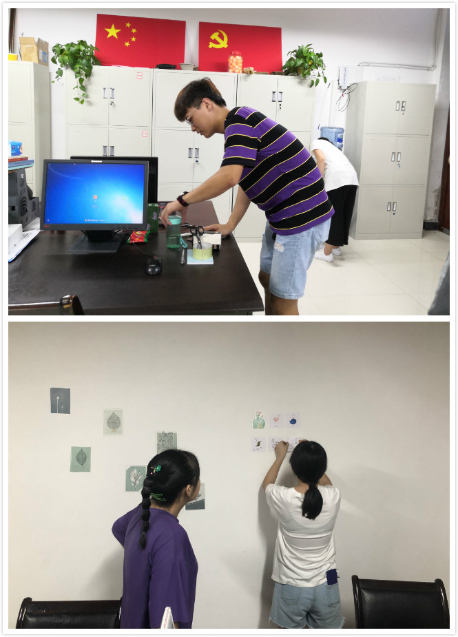 此次教师节特别活动,其意在于表达对老师们的节日祝福,也为了感谢老师们平日里的谆谆教导。通过前期的交流探讨,决定从三个方面入手。其一,准备手绘贺卡,传达祝福。即使同学们有着不成熟的画技,但依然忽视不了他们的用心。醒目的“老师您辛苦了”,简单话语里,是同学们满溢的感激之情。其二,通过对教师办公室的打扫整理,营造干净整洁的办公环境。同学们用自己带来的劳动工具,井井有条地忙碌在外语系的办公室内。经过一番汗水的挥洒,积极的配合,将老师的办公桌擦拭地干干净净,污渍处也清理到位。其三,装饰办公室。思虑良久,同学们选择了清新的绿植墙贴搭配同类开关贴。看似简单的工作,操作起来却费了一番心力。