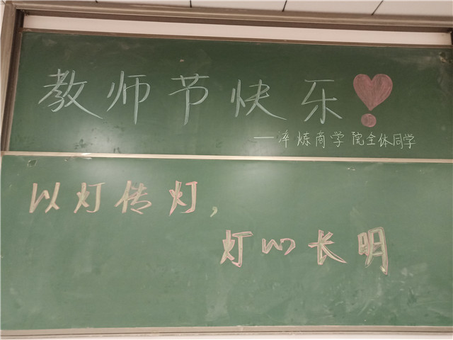 师恩难承,淬炼商学院芊芊学子亦是懂得感恩的人。9月10日一早便开始策划“教师节,送师恩”的活动。在教师节来临前夕,淬炼商学院的学生们便开始忙碌起来,为老师们准备一个别具一格的教师节活动。学生们课余时间在教室办黑板报,整个移通学院五教的教室黑板上都有学生们对老师的祝福语。不仅仅是学生办黑板报这种形式,更是有学生们自己亲手制作的贺卡送给老师。贺卡里有学生对于老师的祝福语,每一个贺卡都制作得十分用心。这份贺卡对于老师和学生来说,是联系师生情谊的纽带。师恩难忘,也许,通过这种方式他们将不断吐露真情。许多同学小时候的梦想都是成为一名人民教师,也许,就是从小有着这样的一种向往,才知道老师是多么伟大。