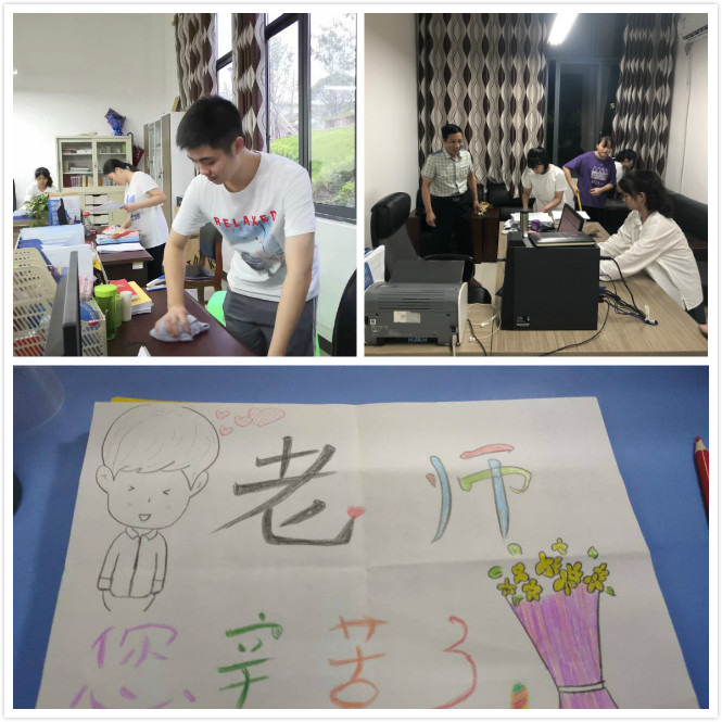 外语系的学子们,在“教师节”来临的前一天,对天渠、荷悦办公室进行打扫和装饰,通过志愿者的精心装扮,老师们的办公环境显得格外温馨。