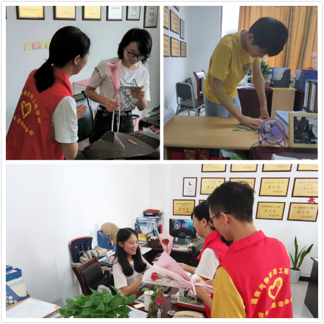 康乃馨花鲜艳的时间短暂,为保证教师们收到丰美的花朵,志愿者们对于花朵的采购与运送工作都是亲力亲为。他们为教师送上花朵,递上包含祝福的明信片,一系列递送的动作收获的是老师们的微笑与喜悦,一句“老师,您辛苦了!教师节快乐!”表达的是志愿者对教师的感激和尊敬之情。在教师们外出的时间里,办公室不是空无一人,而是志愿者们挥动扫帚,擦拭桌柜的身影。提起网线,移动板凳,弯腰、半蹲等动作虽然简单,但仍包含着志愿者们最真挚的情感。临近教师们返回时间,志愿者们的动作愈加迅速,他们在做好清洁后悄悄退出办公室,留下的是无尘的桌椅,洁净的地面。