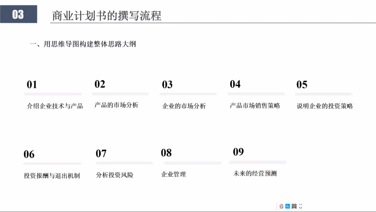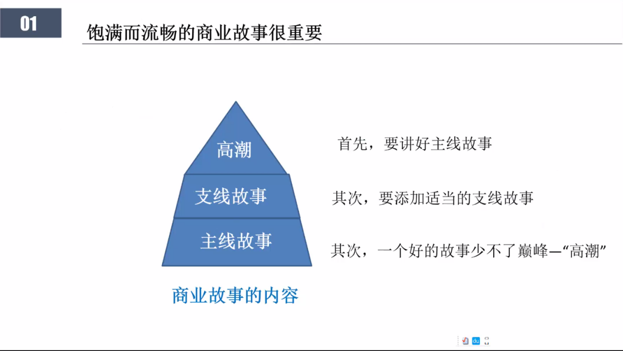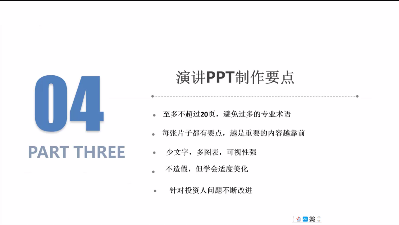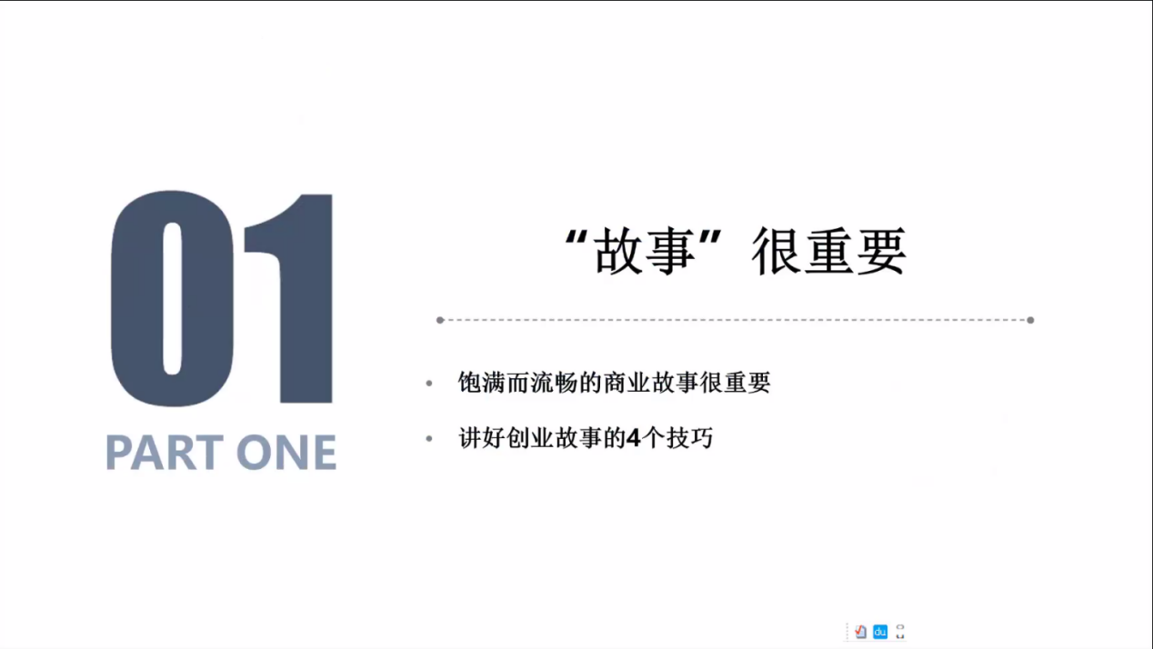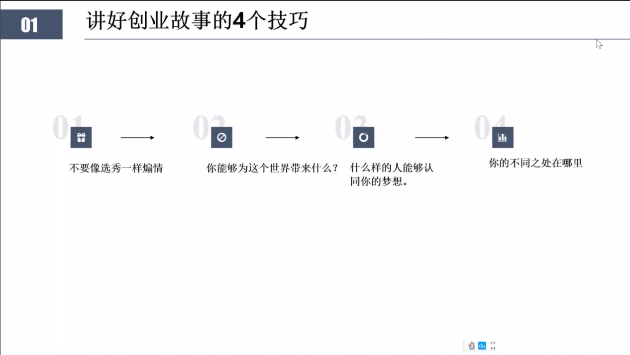 创业是一件实力与运气相结合的事情,卢伯年老师从创业故事入手,讲述寻常方法与特殊方法的区别,将创业计划书形容成一个饱满与流畅的商业故事,进而吸引到CEO的注意力并得到认可。故事的内容上声明要有主线、适当的支线故事以及故事的高潮并且对此总结了4个技巧:首先,不要像选秀一样去煽情;其次在计划书中,要有能为世界带来什么这个方面的要点;再次,在组建团队中,要找寻相同梦想的人,提高成员对产品的参与感;最后,在内容上要有自己与他人的区别。