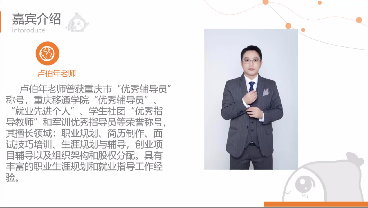 卢伯年,重庆市合川区创新创业导师课成员,曾获重庆市“优秀辅导员”称号,重庆移通学院“优秀辅导员”、“就业先进个人”、学生社团“优秀指导教师”和军训优秀指导员等荣誉称号,其擅长领域:职业规划、简历制作、面试技巧培训、生涯规划与辅导,创业项目辅导以及组织架构和股权分配。具有丰富的职业生涯规划和就业指导工作经验。