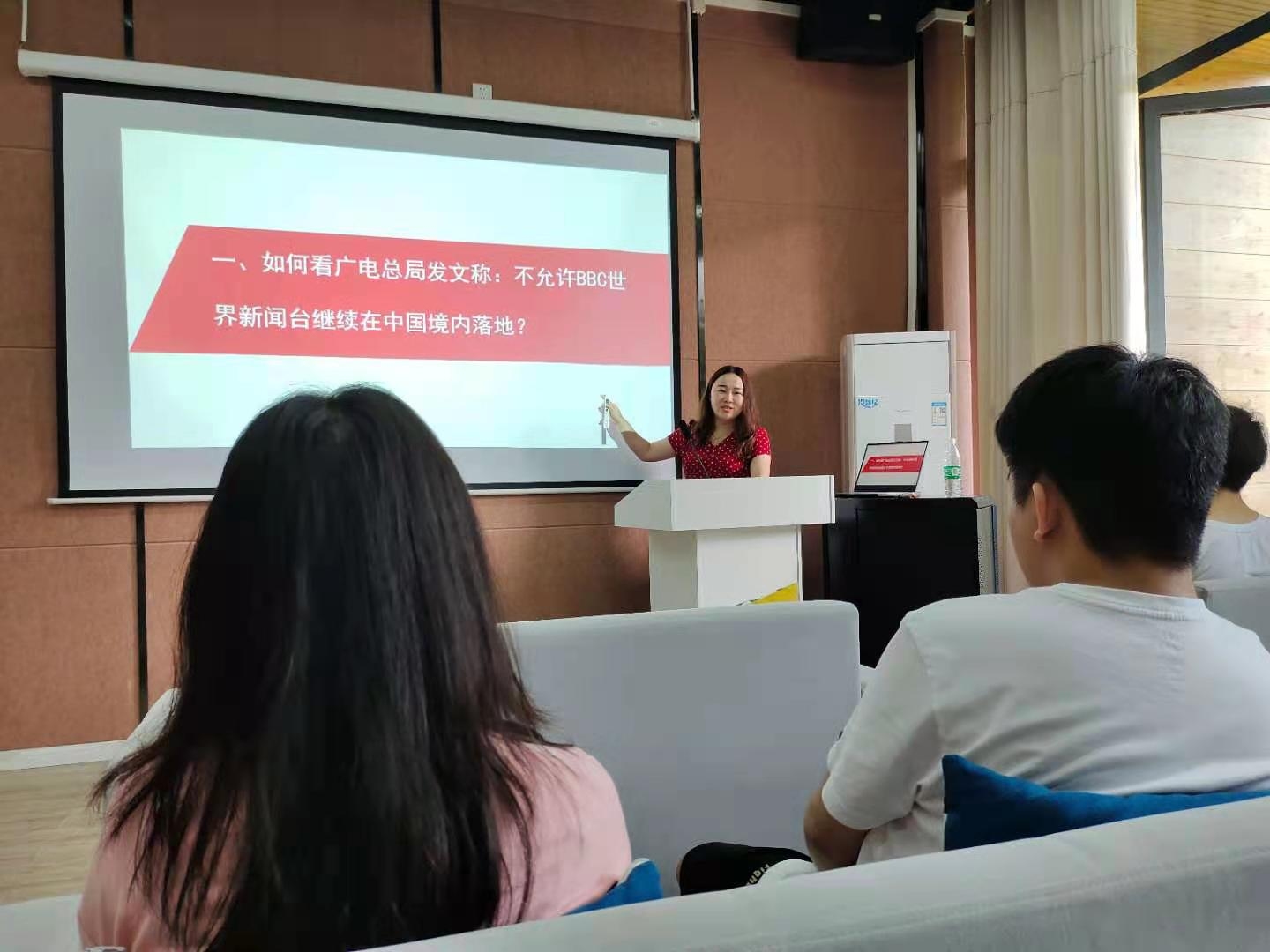 研讨会从“如何看广电总局发文称:不允许BBC世界新闻台继续在中国境内落地?”开始,引发了学生们的思考和讨论。在学生激烈的讨论之后,毕老师向大家展示了一段BBC在我国采访的视频《重回武汉》,让同学们切实地看到了BBC报道与实际事实的严重不符,恶意损害我国形象。随后引出问题“西方媒体为何成为‘造谎机’?”,同时通过几段BBC采访视频再一次让同学们看到“阴间滤镜”“恶意抹黑”等恶劣行径。毕老师也从理论的角度进行了总结:首先,BBC多次制播带有强烈对华意识形态偏见的假新闻,在涉港、涉疆、涉新冠肺炎疫情等问题上散布虚假信息,是对中国进行严重的政治攻击抹黑。其次,英方撤销CGTN落地许可是对CGTN的政治打压,已经公然违背了新闻工作良知。最后,英方一方面标榜所谓新闻自由,另一方面却拿媒体政治属性说事,十分虚伪。毕老师用生动案例的展示和透彻的理论分析,向学生们阐释了BBC世界新闻台涉华报道有关内容是如何严重违反有关规定的,是如何违反新闻应当的真实、公正要求,损害中国国家利益,破坏中国民族团结的,她希望在座学生们在新时代不能失语又失声,一定要多思考怎样向世界“讲好中国故事”。