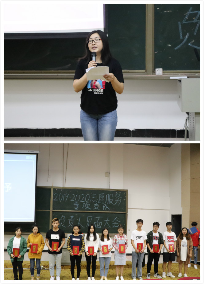 活动开始,由刘月老师为2018-2019学年志愿服务专项支队支队长代表颁发聘书,为他们在过去一年中为志愿服务工作做出的付出和努力,表示肯定和感谢。同时也是激励本届志愿服务专项支队支队长能够继往开来,不忘初心,弘扬支队文化,凝聚支队力量,为我校志愿服务专项支队今后的发展打下坚实基础,为我校志愿服务建设添砖加瓦!