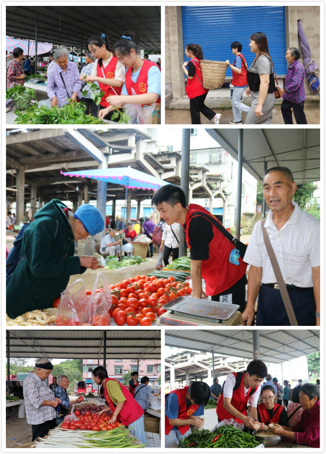 所谓“一日之计在于晨”,听着狗吠鸡鸣,志愿者们碰巧遇上了当地的“赶场”,他们早早的来到了摊位前,帮助爷爷奶奶们一起摆摊吆喝,一起整理摘菜,一起贩卖送货。志愿者们秉承着“专业技能+志愿服务”相结合的模式,抬着一筐筐蔬菜送到摊位,学着打包称重等新技能,他们在干着,爷爷奶奶也在微笑着。志愿者们的帮助虽然只是日常生活的一小步,但这也是志愿服务前行的每一步。