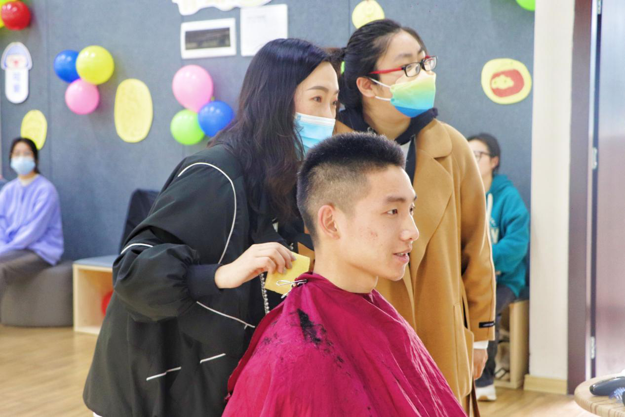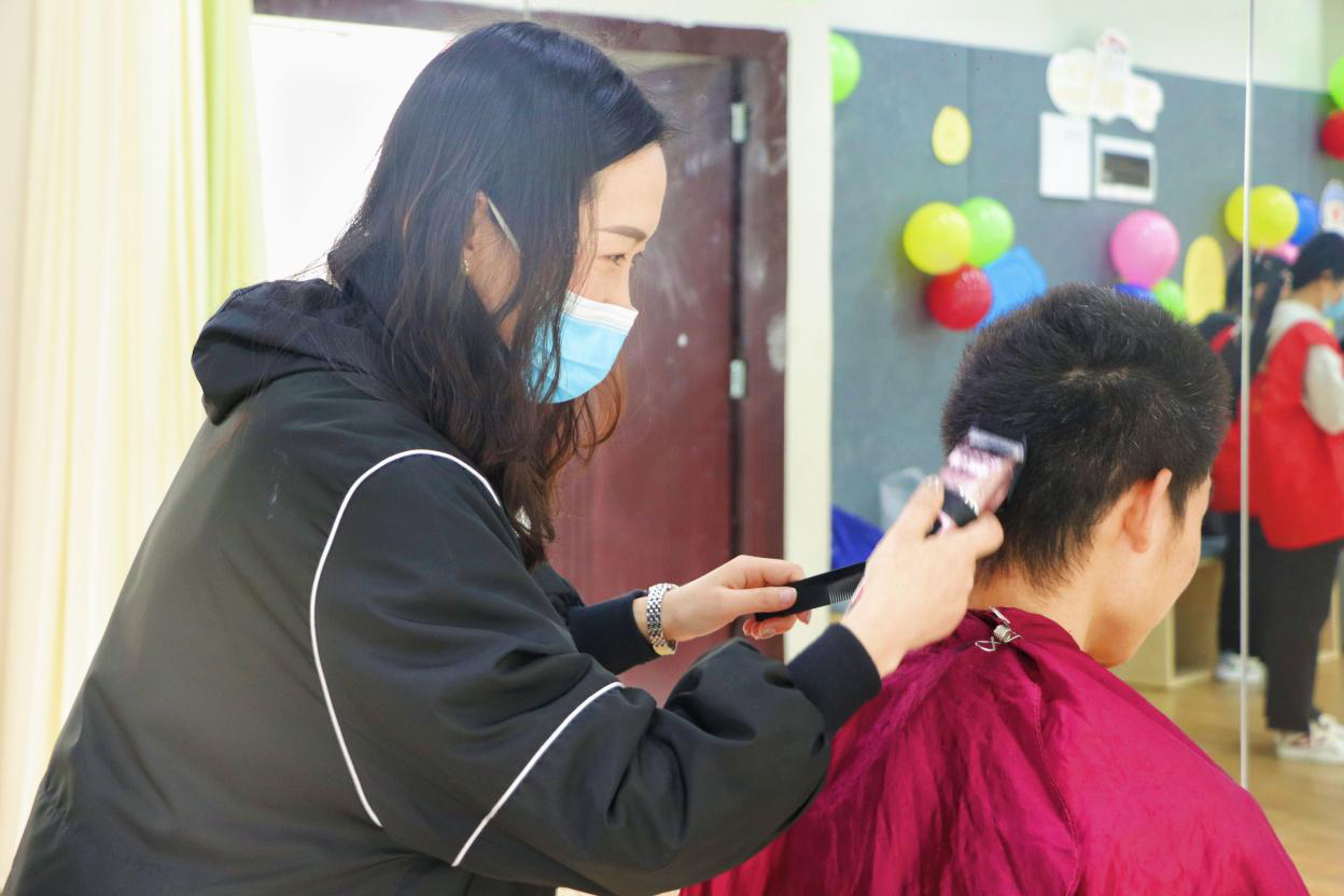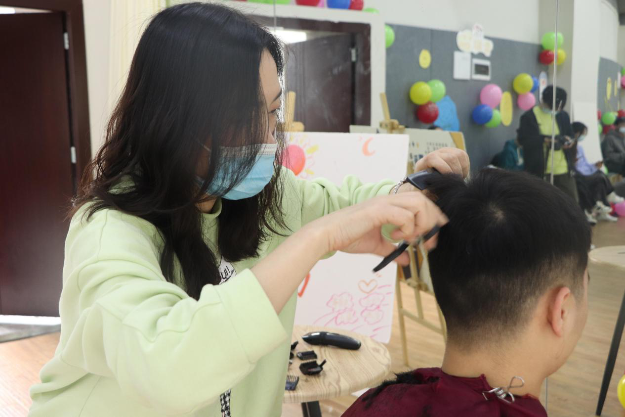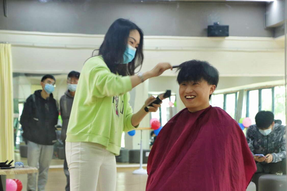 邓老师充分考虑着同学的意愿,体贴细心的询问每一位同学对自己发型的要求,每一根发丝都在她的掌控之中,每一刀都很精准、行云流水,同学们都很喜欢,同学们对邓老师的赞赏和感激之情溢于言表。看着大家理完发后干净利落的样子,志愿者们也感受到无比的快乐,这是来自为他人服务、解决困难的满足感。