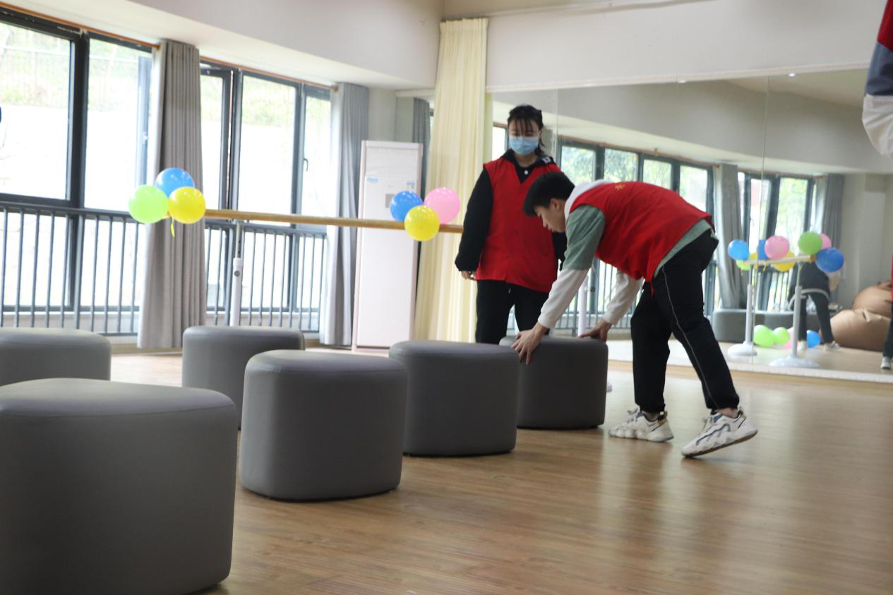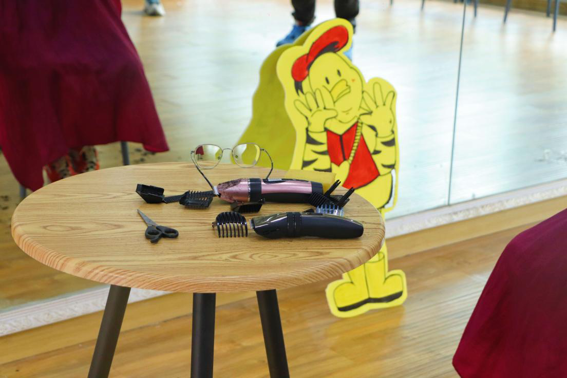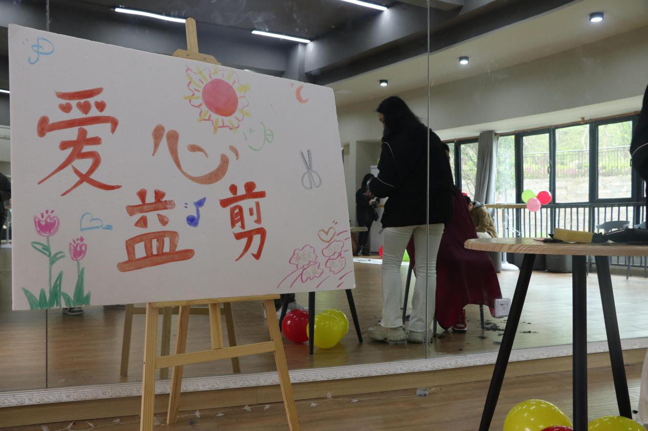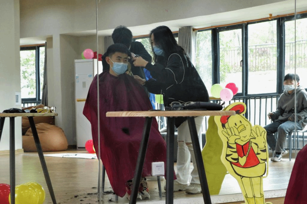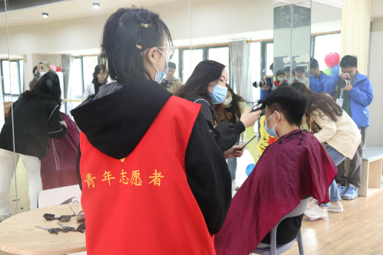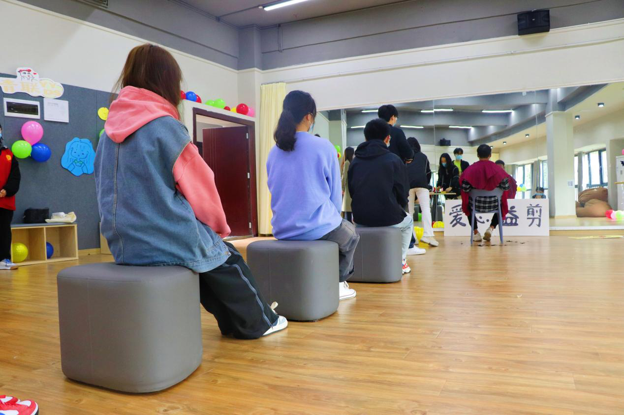 为营造更加温馨有爱的环境,志愿者们早早的来到功能室布置活动现场,红马甲的身影在南湖排练厅不停的穿梭着。参与“爱心益剪”的志愿者和同学们都做好了防疫措施,戴好了口罩,人与人之间保持着1米间距。采取预约时间段理发的方式,避免了人员的聚集。