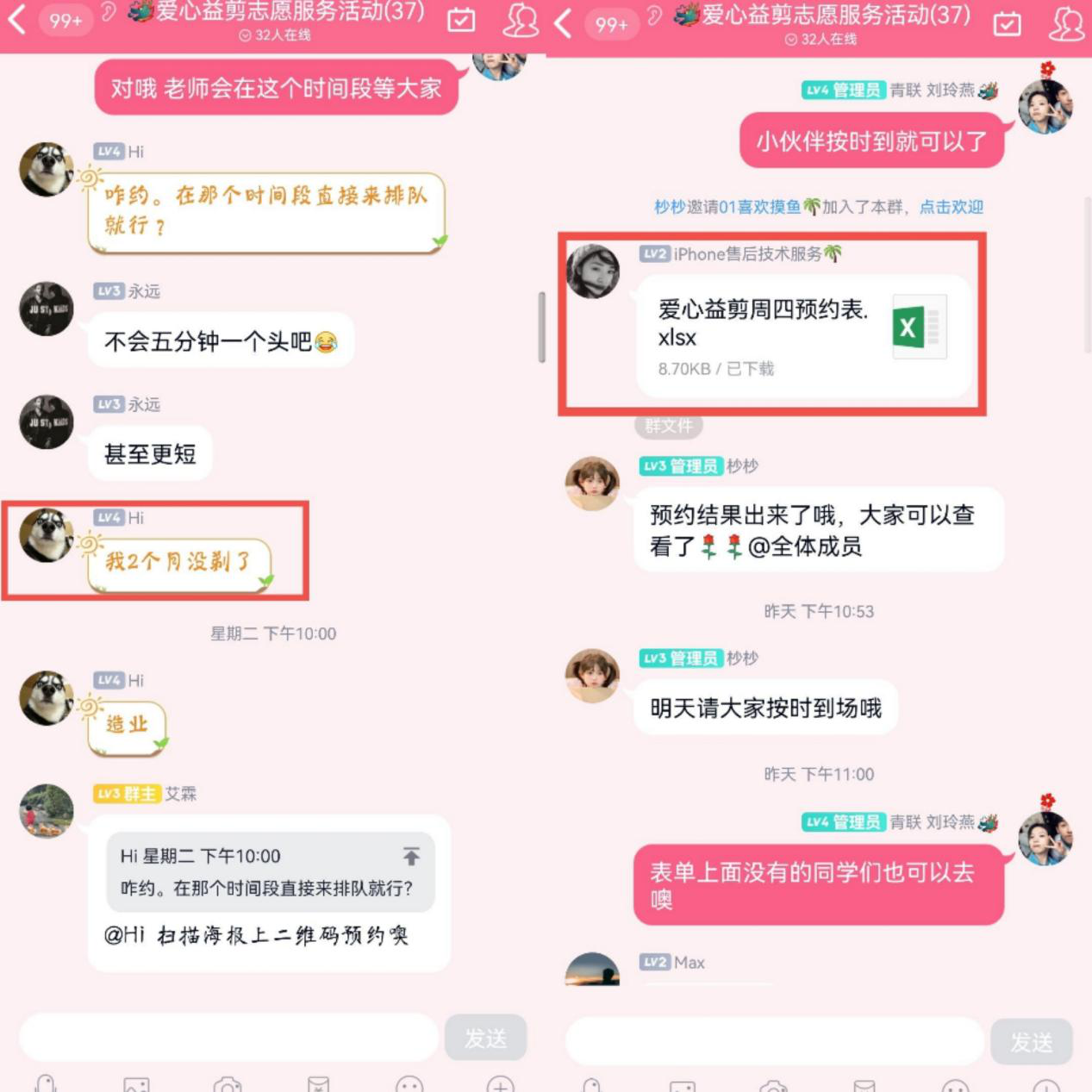 活动前期,移通志愿者们建立了“爱心益剪”活动群。志愿者们在活动群里为同学们答疑解惑,告诉同学们活动当天的流程和注意事项,引导他们积极的参与到“爱心益剪”的活动中来。移通志愿者们在此次活动中起着很好的引导和维持秩序的作用,为保障活动有序地进行打下了基础。