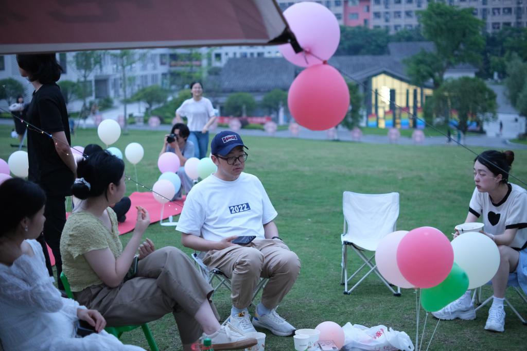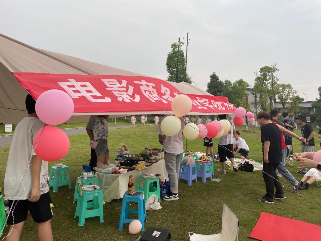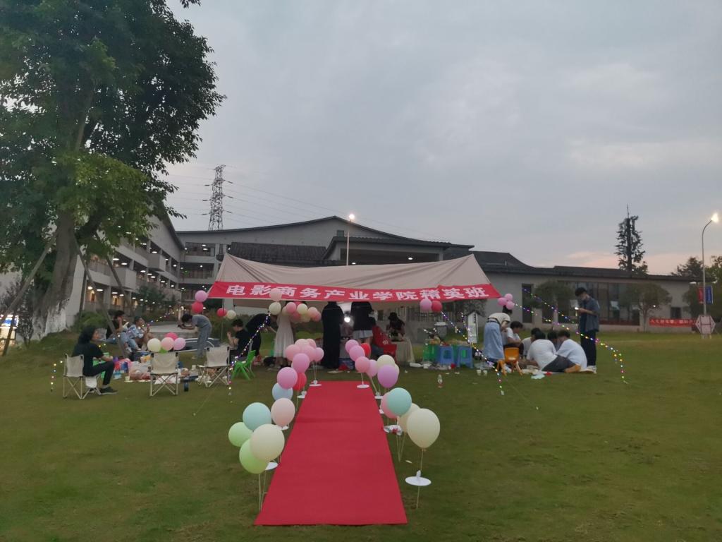 天空渐渐暗了下来,夜色衬托出缠绕着的彩灯的唯美。在音响朦胧的音乐里,同学们三三两两坐在一起聊天,探讨对电影产业的见解,探讨对未来人生的期待,也许正是因为人生有那么多的不确定,才显得每一次的快乐都弥足珍贵。