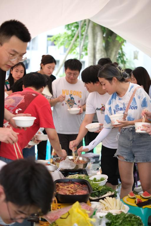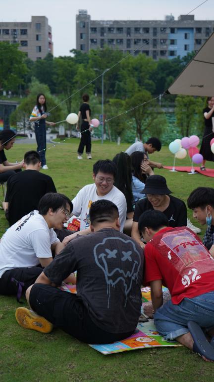 这次团建不仅摆满同学们喜欢的食物,老师还带来三款桌游,同学们坐在野餐垫上玩得不亦乐乎,在游戏中增加班级凝聚力。一轮游戏过去,锅里也“咕嘟咕嘟”地烧开了,倒下一盘盘菜品,大家举着双筷全神贯注,早已跃跃欲试。只待食物悠悠飘起于锅底,像鱼浮出水面,无数只筷子就是伺机而动的鸸鹋,对猎物进行精准捕捉。